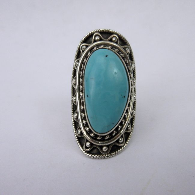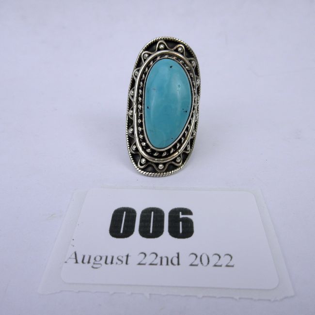 Current Bid: $42.00 [Refresh Price]YOU WILL NEED TO REFRESH THIS PAGE TO SEE UPDATED BID (Log in and this will update automatically) You must LOG IN or REGISTER to see this full page auction listing and bid. Auction is Over Winning Bid Amount: $42.00 **Lot Details: (6t) - Ladies 925 sterling silver ring with Turquoise. Beautiful hand tooled vintage ring with large Turquoise stone, size 7.5, weight 11.5 grams Log in to add this lot to your watch list or place a bid |