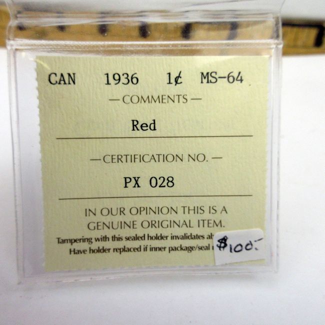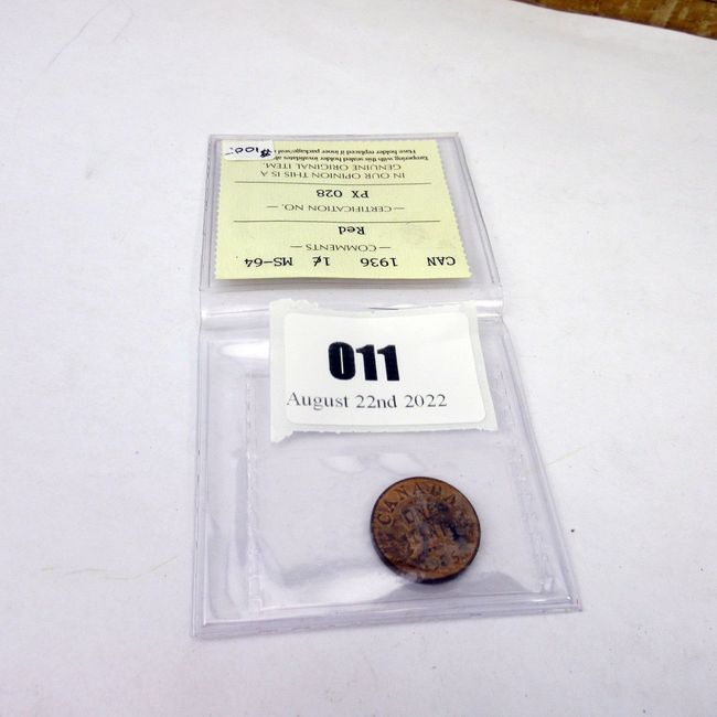 Current Bid: $77.00 [Refresh Price]YOU WILL NEED TO REFRESH THIS PAGE TO SEE UPDATED BID (Log in and this will update automatically) You must LOG IN or REGISTER to see this full page auction listing and bid. Auction is Over Winning Bid Amount: $77.00 **Lot Details: (11t) - Canada 1936 One Cent, ICCS certified MS-64 "Red". Extremely rare with original red mint lustre. Gorgeous coin Log in to add this lot to your watch list or place a bid |