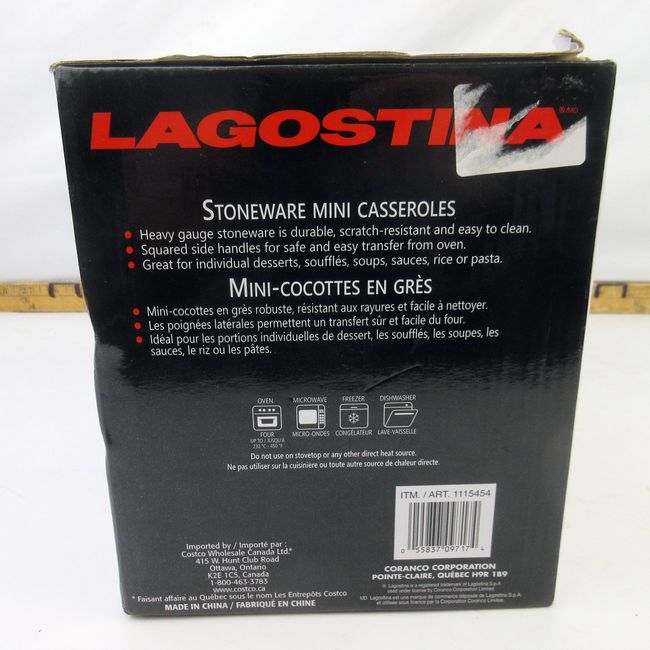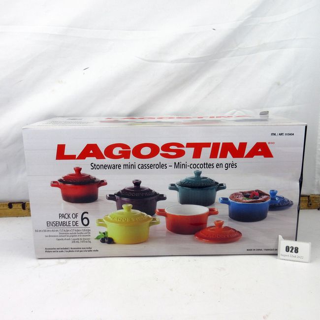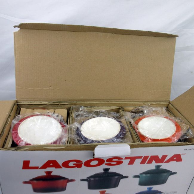 Current Bid: $27.00 [Refresh Price]YOU WILL NEED TO REFRESH THIS PAGE TO SEE UPDATED BID (Log in and this will update automatically) You must LOG IN or REGISTER to see this full page auction listing and bid. Auction is Over Winning Bid Amount: $27.00 **Lot Details: (28t) - New Lagostina 6 Stoneware Casseroles, box lid opened to ensure NEW in original packaging never used Log in to add this lot to your watch list or place a bid |