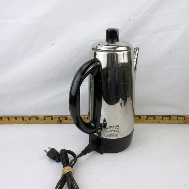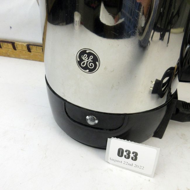 Current Bid: $20.00 [Refresh Price]YOU WILL NEED TO REFRESH THIS PAGE TO SEE UPDATED BID (Log in and this will update automatically) You must LOG IN or REGISTER to see this full page auction listing and bid. Auction is Over Winning Bid Amount: $20.00 **Lot Details: (33t) - Barely used GE Electric Coffee Percolator w Lock Top, nice and clean condition Log in to add this lot to your watch list or place a bid |