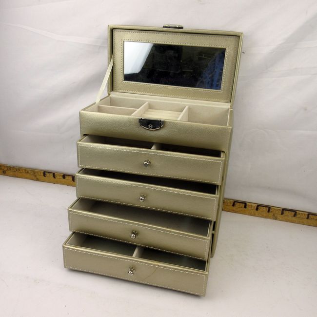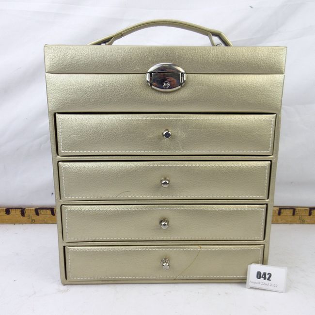 Current Bid: $15.00 [Refresh Price]YOU WILL NEED TO REFRESH THIS PAGE TO SEE UPDATED BID (Log in and this will update automatically) You must LOG IN or REGISTER to see this full page auction listing and bid. Auction is Over Winning Bid Amount: $15.00 **Lot Details: (42t) - Keyed Travel Standing Jewelry Handled 4 drawer plus flip up mirrored top section, 10 1/2" high no handle x 5" deep x 9 1/2" wide Log in to add this lot to your watch list or place a bid |