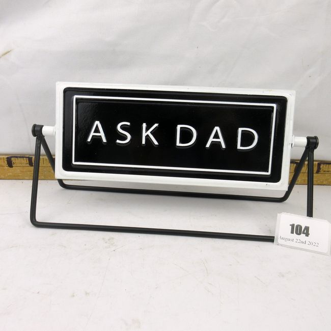 Current Bid: $[Refresh Price]YOU WILL NEED TO REFRESH THIS PAGE TO SEE UPDATED BID (Log in and this will update automatically) You must LOG IN or REGISTER to see this full page auction listing and bid. Auction is Over Winning Bid Amount: $This item did not sell **Lot Details: (104t) - Revolving double sided table top sign, Ask Dad, Ask Mom. 10"L x 5.5"H Log in to add this lot to your watch list or place a bid |