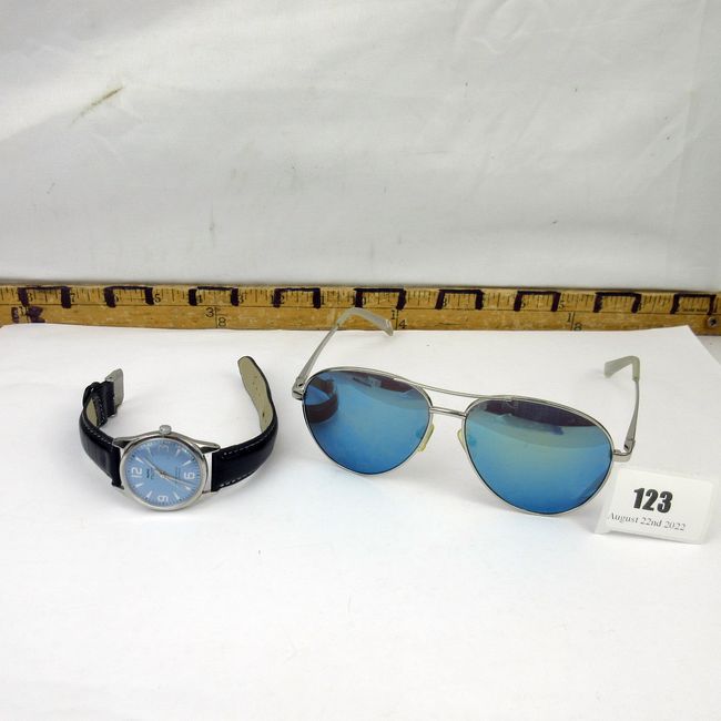 Current Bid: $12.00 [Refresh Price]YOU WILL NEED TO REFRESH THIS PAGE TO SEE UPDATED BID (Log in and this will update automatically) You must LOG IN or REGISTER to see this full page auction listing and bid. Auction is Over Winning Bid Amount: $12.00 **Lot Details: (123t) - Pilot, manual wind men's watch, works great and sunglasses. Log in to add this lot to your watch list or place a bid |