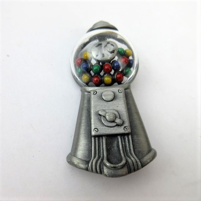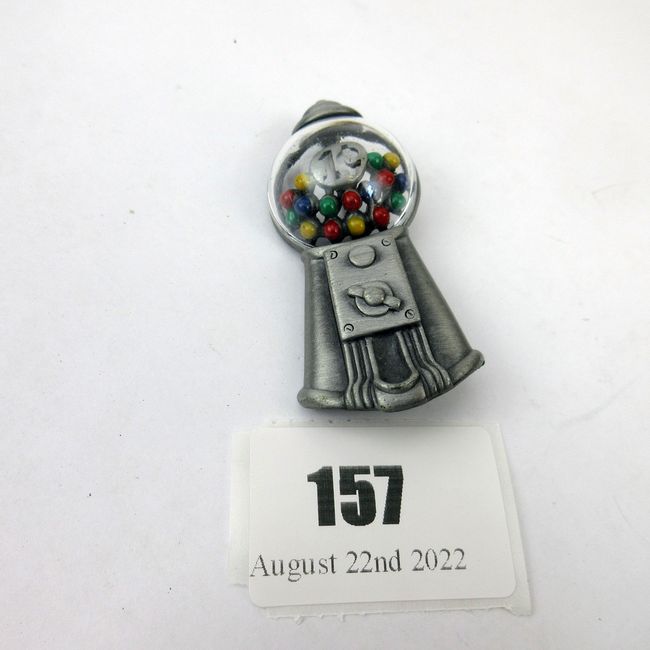 Current Bid: $5.00 [Refresh Price]YOU WILL NEED TO REFRESH THIS PAGE TO SEE UPDATED BID (Log in and this will update automatically) You must LOG IN or REGISTER to see this full page auction listing and bid. Auction is Over Winning Bid Amount: $5.00 **Lot Details: (157t) - Very neat gumball machine 1 Cent brooch pin, marked AJC Log in to add this lot to your watch list or place a bid |