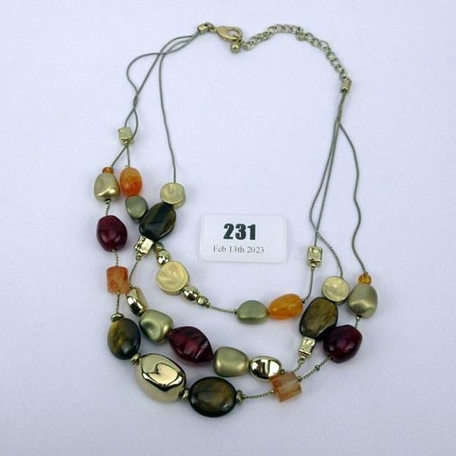 Current Bid: $5.00 [Refresh Price]YOU WILL NEED TO REFRESH THIS PAGE TO SEE UPDATED BID (Log in and this will update automatically) You must LOG IN or REGISTER to see this full page auction listing and bid. Auction is Over Winning Bid Amount: $5.00 **Lot Details: (231q) - Really nice Earthtones 3 strand well done Necklace Log in to add this lot to your watch list or place a bid |