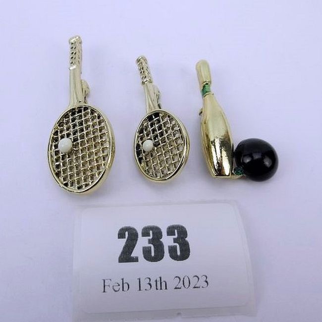 Current Bid: $5.00 [Refresh Price]YOU WILL NEED TO REFRESH THIS PAGE TO SEE UPDATED BID (Log in and this will update automatically) You must LOG IN or REGISTER to see this full page auction listing and bid. Auction is Over Winning Bid Amount: $5.00 **Lot Details: (233q) - 3 Vintage signed Gerry's Brooches in barely used condition, 2 different sized Tennis Squash Rackets and Bowling Ball w Pin Log in to add this lot to your watch list or place a bid |