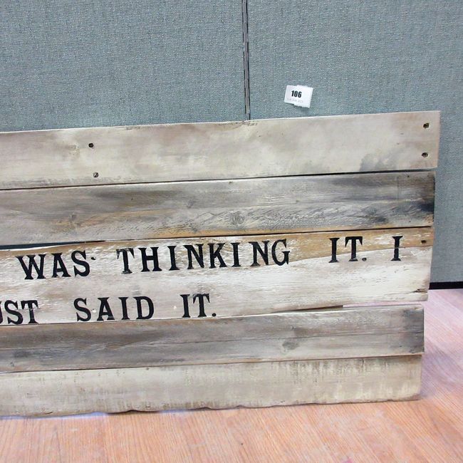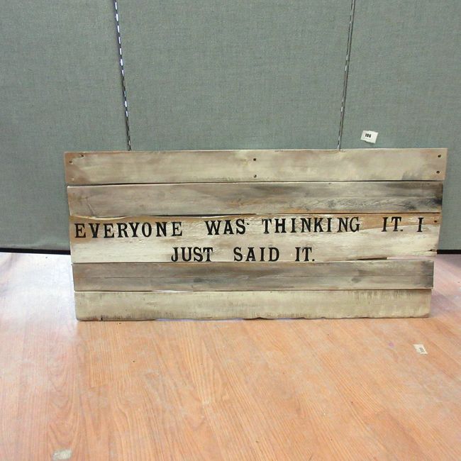 Current Bid: $5.00 [Refresh Price]YOU WILL NEED TO REFRESH THIS PAGE TO SEE UPDATED BID (Log in and this will update automatically) You must LOG IN or REGISTER to see this full page auction listing and bid. Auction is Over Winning Bid Amount: $5.00 **Lot Details: (016r) - Custom wall art Everyone Was Thinking It, I Just Said It. 40" x 19" Log in to add this lot to your watch list or place a bid |