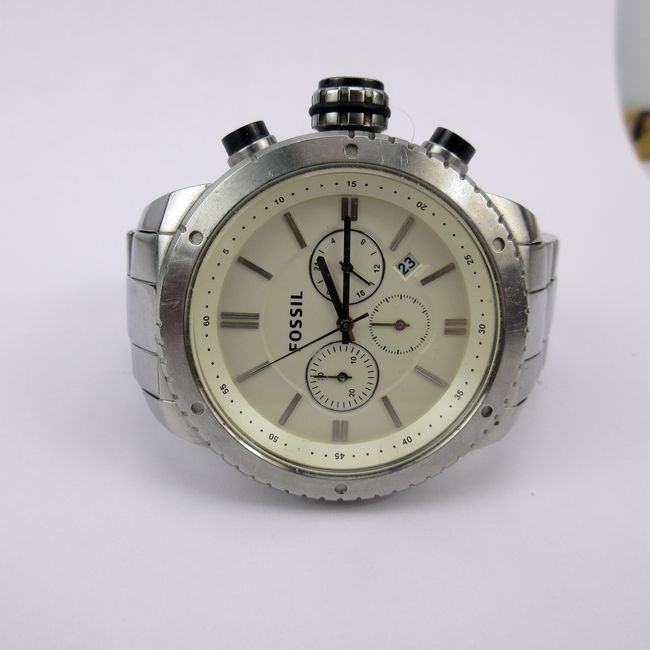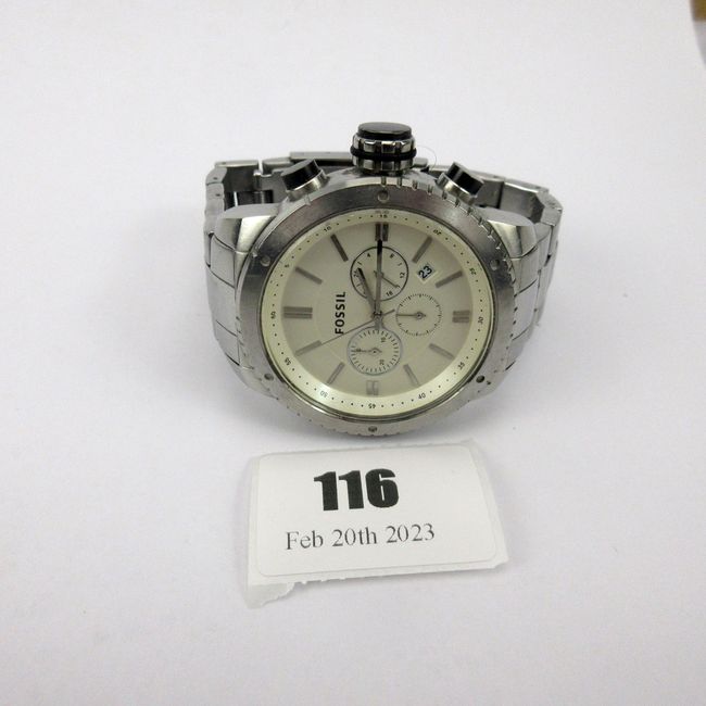 Current Bid: $22.00 [Refresh Price]YOU WILL NEED TO REFRESH THIS PAGE TO SEE UPDATED BID (Log in and this will update automatically) You must LOG IN or REGISTER to see this full page auction listing and bid. Auction is Over Winning Bid Amount: $22.00 **Lot Details: (116r) - Fossil watch with metal band and white face. Beautiful watch Log in to add this lot to your watch list or place a bid |
