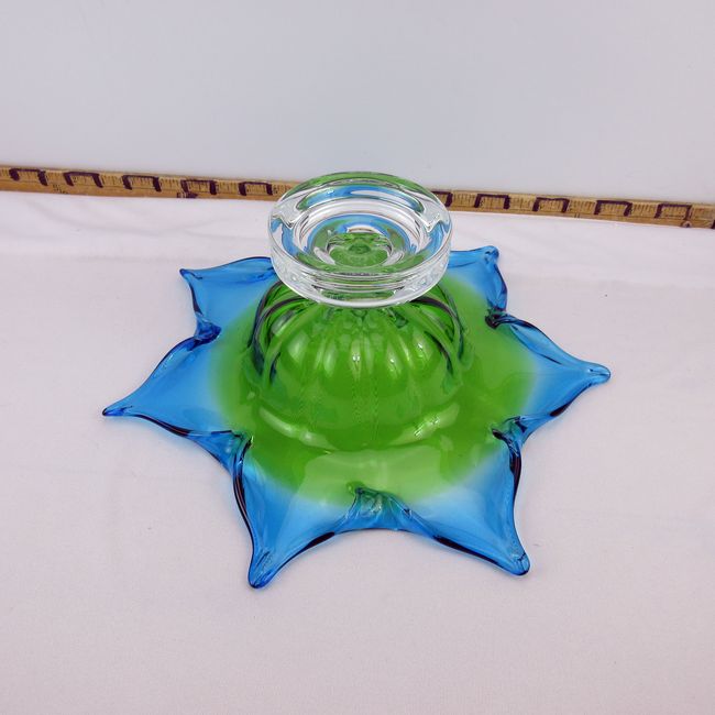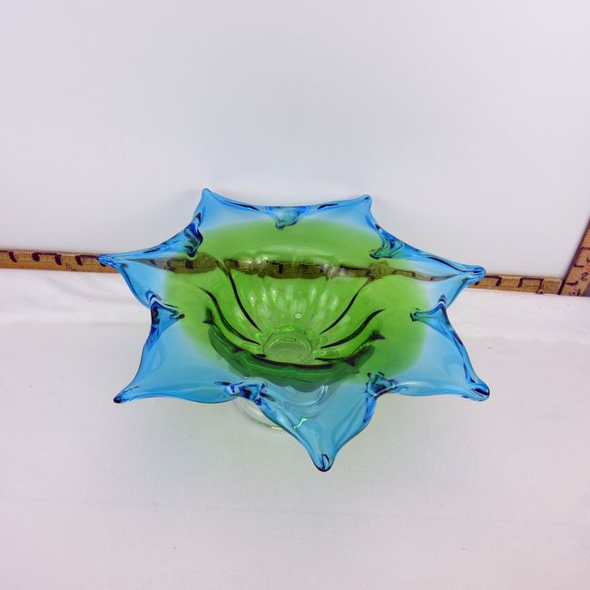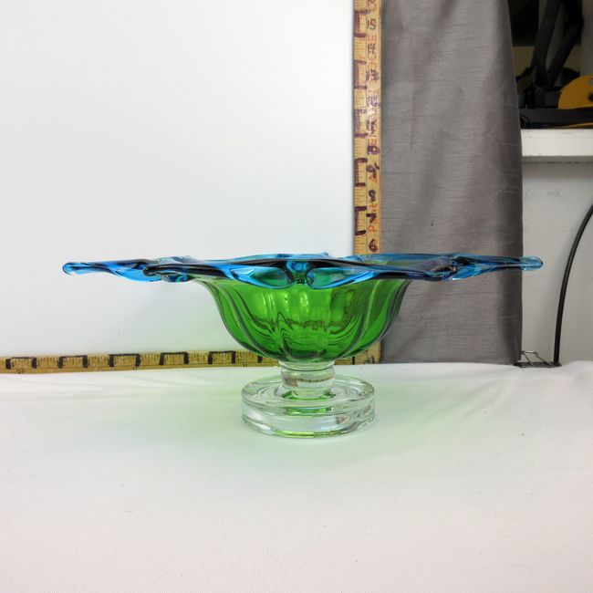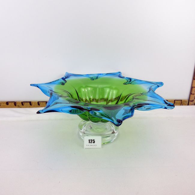 Current Bid: $22.00 [Refresh Price]YOU WILL NEED TO REFRESH THIS PAGE TO SEE UPDATED BID (Log in and this will update automatically) You must LOG IN or REGISTER to see this full page auction listing and bid. Auction is Over Winning Bid Amount: $22.00 **Lot Details: (125r) - A gorgeous vintage blue over green art glass centrepiece bowl on a glass pedestal. Unsure of exact age/origin but this piece truly has fantastic colours! Approximately 13.5” wide and 5” tall. Log in to add this lot to your watch list or place a bid |
