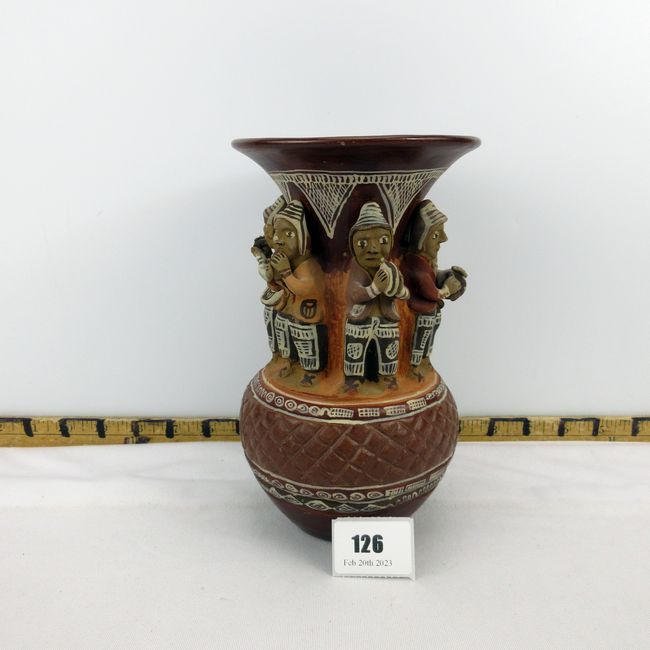 Current Bid: $21.00 [Refresh Price]YOU WILL NEED TO REFRESH THIS PAGE TO SEE UPDATED BID (Log in and this will update automatically) You must LOG IN or REGISTER to see this full page auction listing and bid. Auction is Over Winning Bid Amount: $21.00 **Lot Details: (126r) - A fantastic vintage hand crafts Peruvian pottery vase. Amazing three dimensional details! Very good condition. Just over 8” tall. Log in to add this lot to your watch list or place a bid |