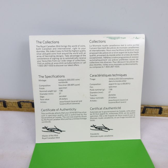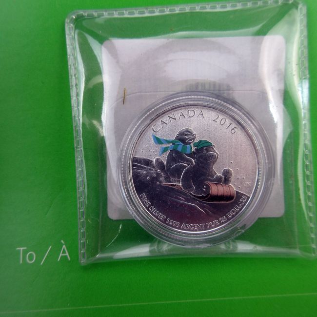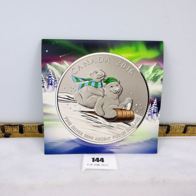 Current Bid: $54.00 [Refresh Price]YOU WILL NEED TO REFRESH THIS PAGE TO SEE UPDATED BID (Log in and this will update automatically) You must LOG IN or REGISTER to see this full page auction listing and bid. Auction is Over Winning Bid Amount: $54.00 **Lot Details: (144r) - Limited edition Canada 2016 fine .9999 silver $25 specimen coin with colourized toque, scarf and sleigh. Complete with information card and encapsulated in plastic. Log in to add this lot to your watch list or place a bid |