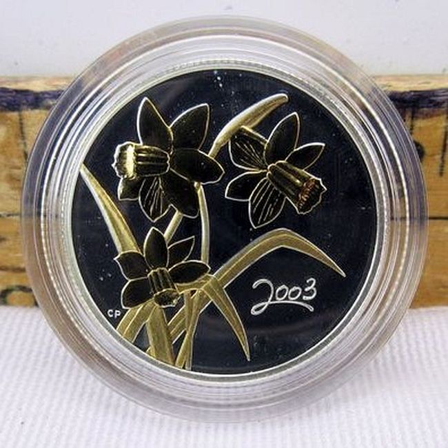 Current Bid: $59.00 [Refresh Price]YOU WILL NEED TO REFRESH THIS PAGE TO SEE UPDATED BID (Log in and this will update automatically) You must LOG IN or REGISTER to see this full page auction listing and bid. Auction is Over Winning Bid Amount: $59.00 **Lot Details: (146r) - Royal Canadian Mint Golden Daffodil sterling silver coin with gold plated daffodils design. Encapsulated in plastic and also comes in a nice storage/display clamshell case, also comes with paperwork. This is a very limited edition coin with only Log in to add this lot to your watch list or place a bid |