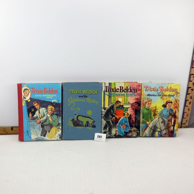 Current Bid: $11.55 [Refresh Price]YOU WILL NEED TO REFRESH THIS PAGE TO SEE UPDATED BID (Log in and this will update automatically) You must LOG IN or REGISTER to see this full page auction listing and bid. Auction is Over Winning Bid Amount: $11.55 **Lot Details: (202r) - 4 vintage Trixie Belden Whitman books. The Mysterious Visitor 1954, Mystery Off Glen Road 1956, The Gatehouse Mystery 1951 no dust jacket, The Mysterious Code 1971 Log in to add this lot to your watch list or place a bid |