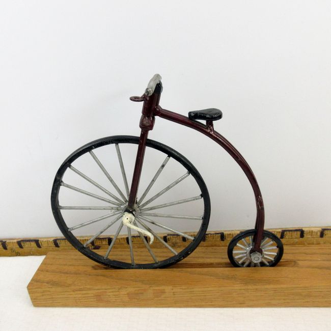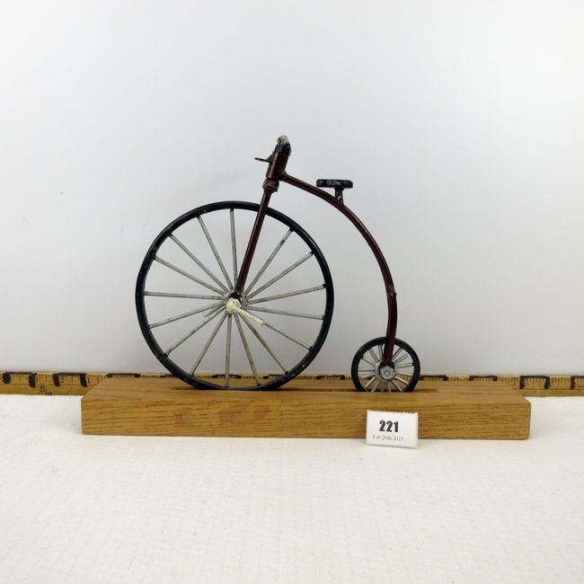 Current Bid: $40.01 [Refresh Price]YOU WILL NEED TO REFRESH THIS PAGE TO SEE UPDATED BID (Log in and this will update automatically) You must LOG IN or REGISTER to see this full page auction listing and bid. Auction is Over Winning Bid Amount: $40.01 **Lot Details: (221r) - Vintage Penny Farthing type metal bike on Oak stand, detachable. 14 3/4"W x 9.5"H x 2.5"W Log in to add this lot to your watch list or place a bid |