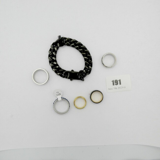 Current Bid: $17.00 [Refresh Price]YOU WILL NEED TO REFRESH THIS PAGE TO SEE UPDATED BID (Log in and this will update automatically) You must LOG IN or REGISTER to see this full page auction listing and bid. Auction is Over Winning Bid Amount: $17.00 **Lot Details: (LOT: G191) - A collection of men’s stainless and tungsten rings. Also a solid heavy black stainless steel bracelet. Log in to add this lot to your watch list or place a bid |