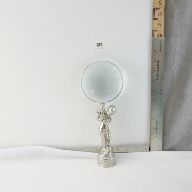 Current Bid: $44.25 [Refresh Price]YOU WILL NEED TO REFRESH THIS PAGE TO SEE UPDATED BID (Log in and this will update automatically) You must LOG IN or REGISTER to see this full page auction listing and bid. Auction is Over Winning Bid Amount: $44.25 **Lot Details: (LOT: G193) - A very unique vintage magnifying glass with no marks on it whatsoever. It is quite heavy and non-magnetic. The glass does have two minor scuffs on it. Definitely an interesting piece. Log in to add this lot to your watch list or place a bid |