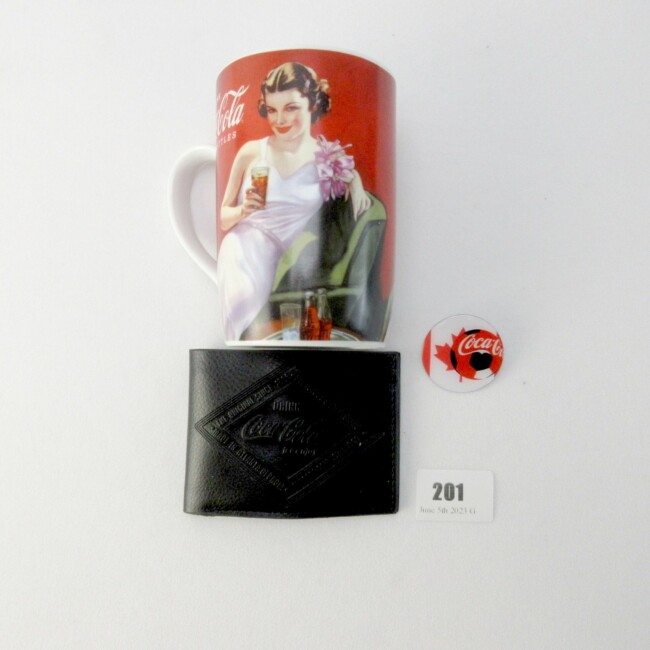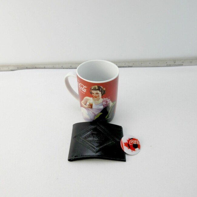 Current Bid: $7.00 [Refresh Price]YOU WILL NEED TO REFRESH THIS PAGE TO SEE UPDATED BID (Log in and this will update automatically) You must LOG IN or REGISTER to see this full page auction listing and bid. Auction is Over Winning Bid Amount: $7.00 **Lot Details: (LOT: G201) - A new black Coca-Cola wallet, a Coca-Cola coffee mug with a pin-up girl drinking Coke and a Coca-Cola soccer pin. Log in to add this lot to your watch list or place a bid |
