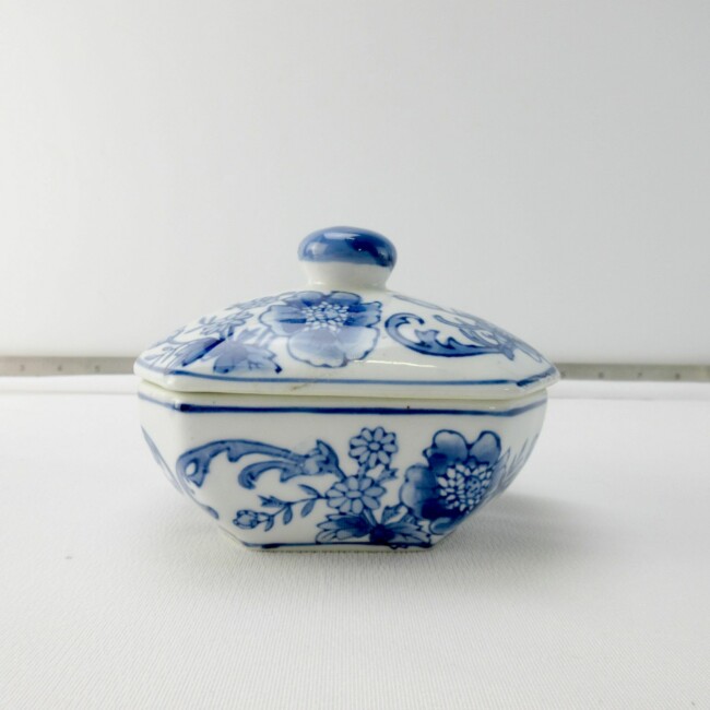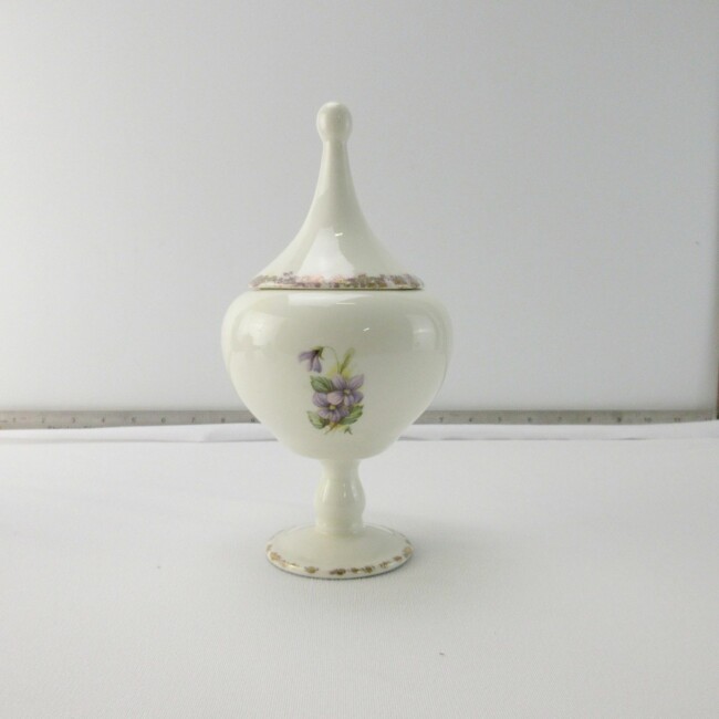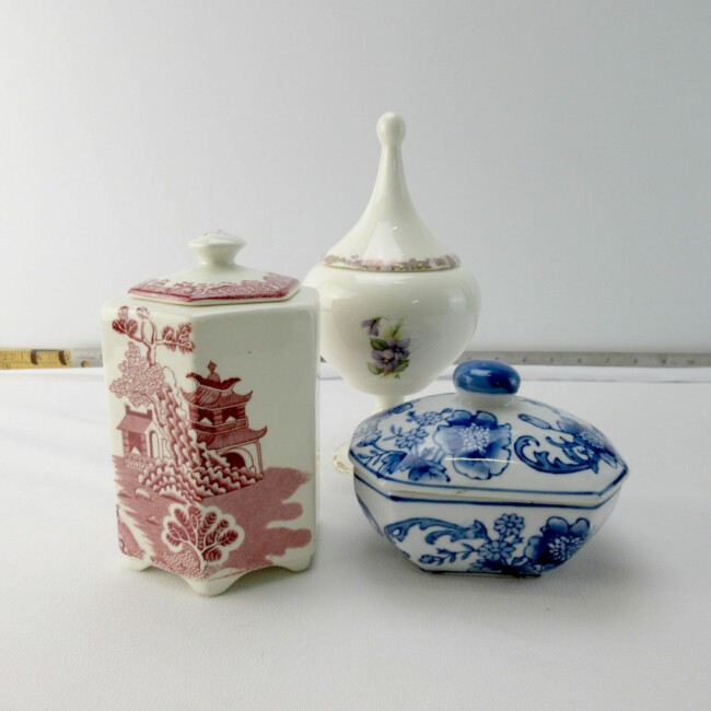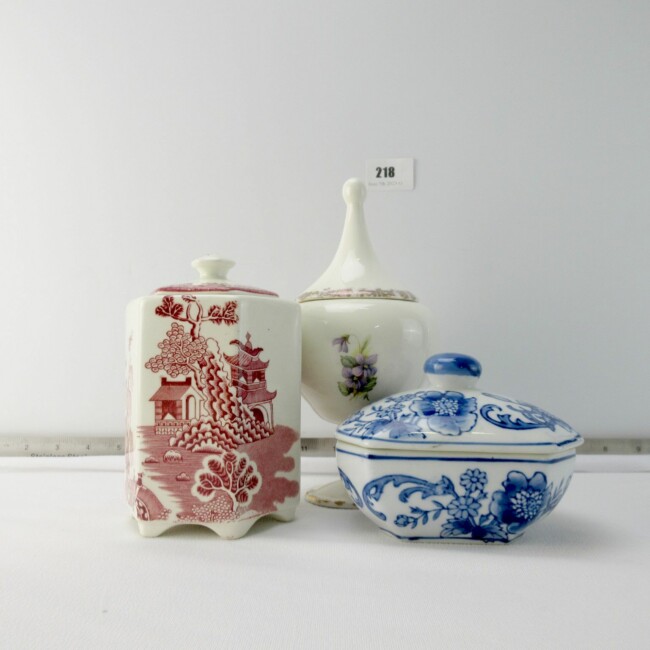 Current Bid: $5.00 [Refresh Price]YOU WILL NEED TO REFRESH THIS PAGE TO SEE UPDATED BID (Log in and this will update automatically) You must LOG IN or REGISTER to see this full page auction listing and bid. Auction is Over Winning Bid Amount: $5.00 **Lot Details: (LOT: G218) - Three candy or whatnot jars/containers. The pink Hexagon one is 5” high without lid & marked: Mason’s Patent Ironstone China, made in England. The blue one is 5” long by 3” wide by 2” high not including lid... Log in to add this lot to your watch list or place a bid |