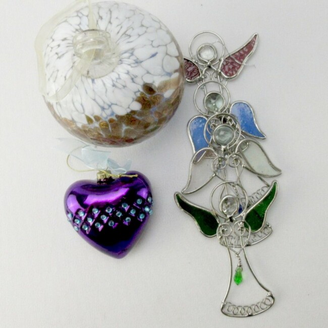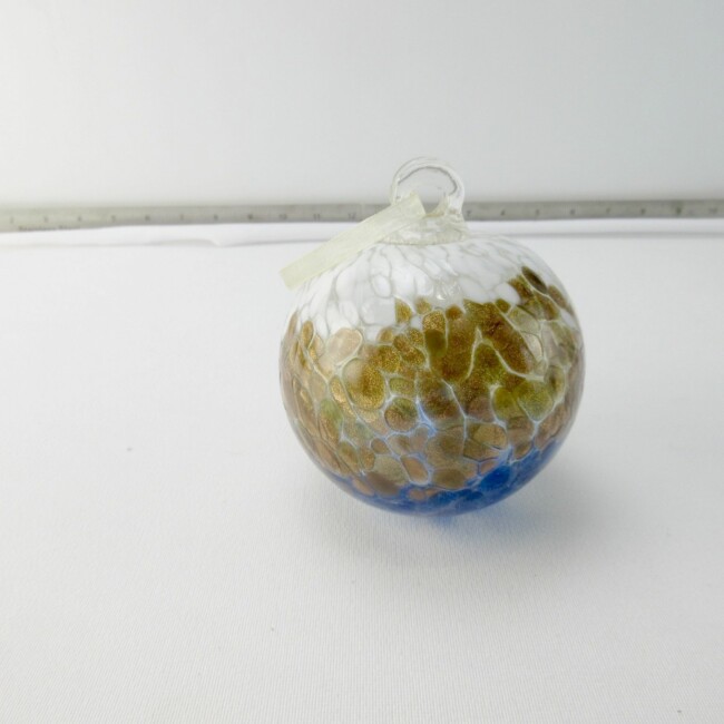 Current Bid: $7.00 [Refresh Price]YOU WILL NEED TO REFRESH THIS PAGE TO SEE UPDATED BID (Log in and this will update automatically) You must LOG IN or REGISTER to see this full page auction listing and bid. Auction is Over Winning Bid Amount: $7.00 **Lot Details: (LOT: G222) - Hand blown glass Friendship ball, 4 ½” long & 12” in diameter. White, gold & blue large specks of colors. It does have a nice weight to it. Also, a 2 ½” x 2 ½” deep purple glass ornament with Aquamarine cr... Log in to add this lot to your watch list or place a bid |