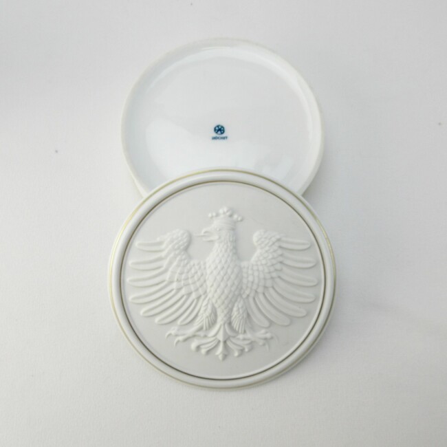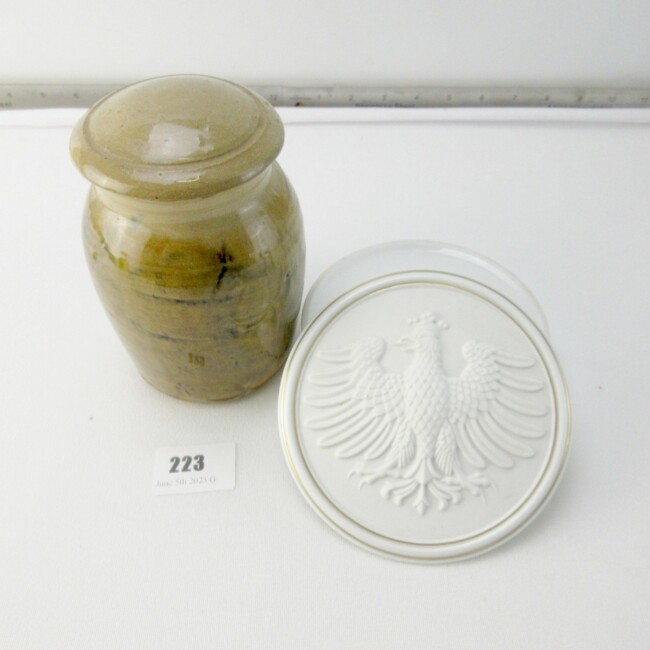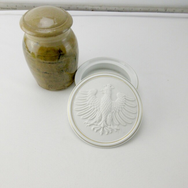 Current Bid: $[Refresh Price]YOU WILL NEED TO REFRESH THIS PAGE TO SEE UPDATED BID (Log in and this will update automatically) You must LOG IN or REGISTER to see this full page auction listing and bid. Auction is Over Winning Bid Amount: $This item did not sell **Lot Details: (LOT: G223) - A lovely 5” round porcelain dish. It has a gorgeous, raised Phoenix Bird on the lid. It is marked Hochst & made in Germany. It is a little more than 1 ½” high with lid. Plus, a 5 ½” high pottery vase with lid... Log in to add this lot to your watch list or place a bid |