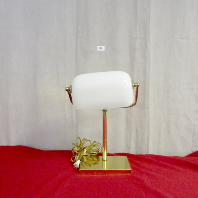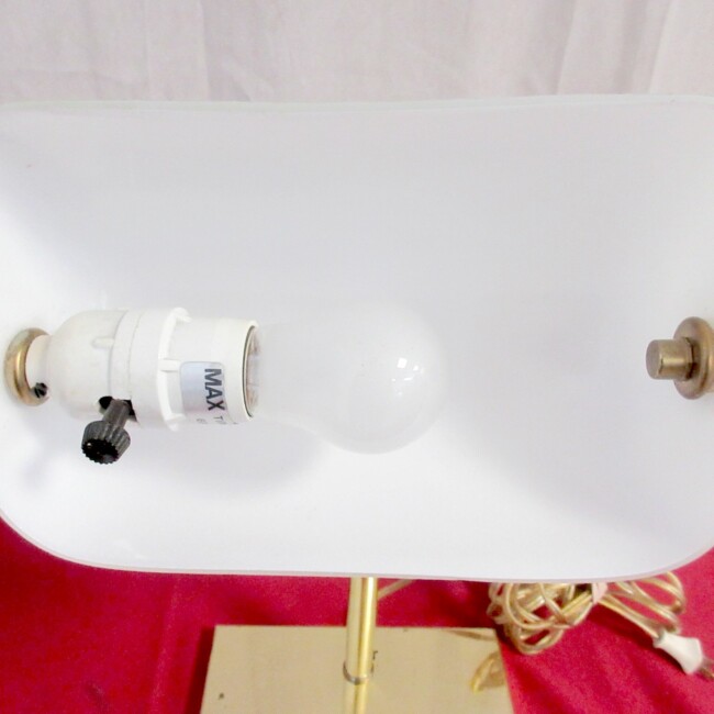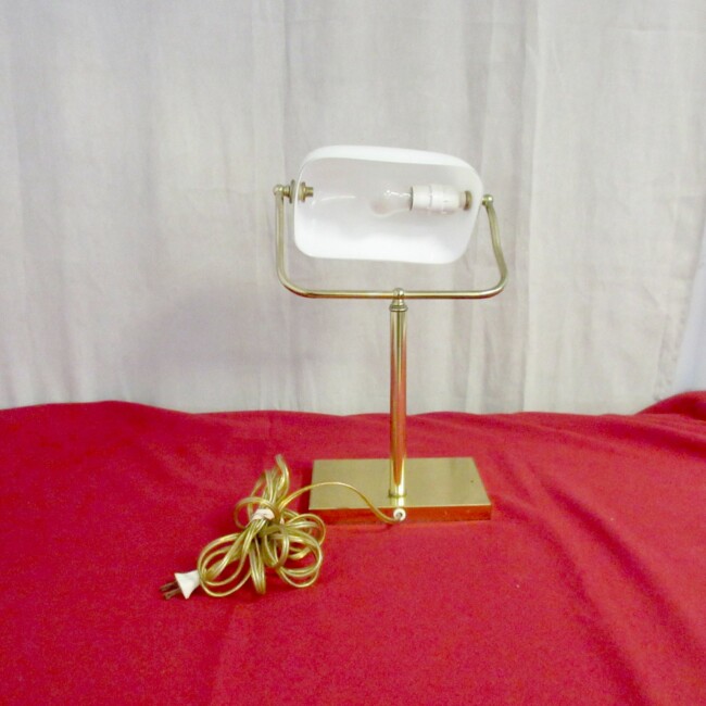 Current Bid: $5.00 [Refresh Price]YOU WILL NEED TO REFRESH THIS PAGE TO SEE UPDATED BID (Log in and this will update automatically) You must LOG IN or REGISTER to see this full page auction listing and bid. Auction is Over Winning Bid Amount: $5.00 **Lot Details: (LOT: G237) - Rare White Vintage Swivel Glass Shade Brass Library Lamp with 145" long cord, 16" high x 10 1/2" wide working with a new lightbulb Log in to add this lot to your watch list or place a bid |
