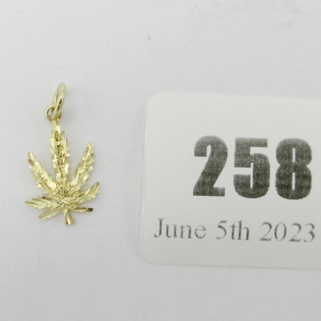 Current Bid: $57.00 [Refresh Price]YOU WILL NEED TO REFRESH THIS PAGE TO SEE UPDATED BID (Log in and this will update automatically) You must LOG IN or REGISTER to see this full page auction listing and bid. Auction is Over Winning Bid Amount: $57.00 **Lot Details: (LOT: G258) - 10K GOLD Marijuana Leaf Pendant, Perfect for The Cool Father Father's Day Gift its Legal lol Log in to add this lot to your watch list or place a bid |