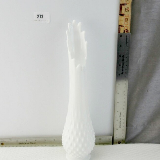 Current Bid: $36.00 [Refresh Price]YOU WILL NEED TO REFRESH THIS PAGE TO SEE UPDATED BID (Log in and this will update automatically) You must LOG IN or REGISTER to see this full page auction listing and bid. Auction is Over Winning Bid Amount: $36.00 **Lot Details: (LOT: G272) - Beautiful vintage signed Fenton art glass vase with drawn top and hobnail design on the base. Approx 13.5" and in excellent condition. Log in to add this lot to your watch list or place a bid |