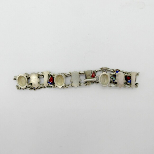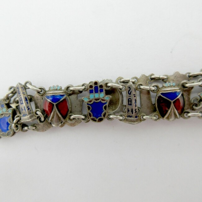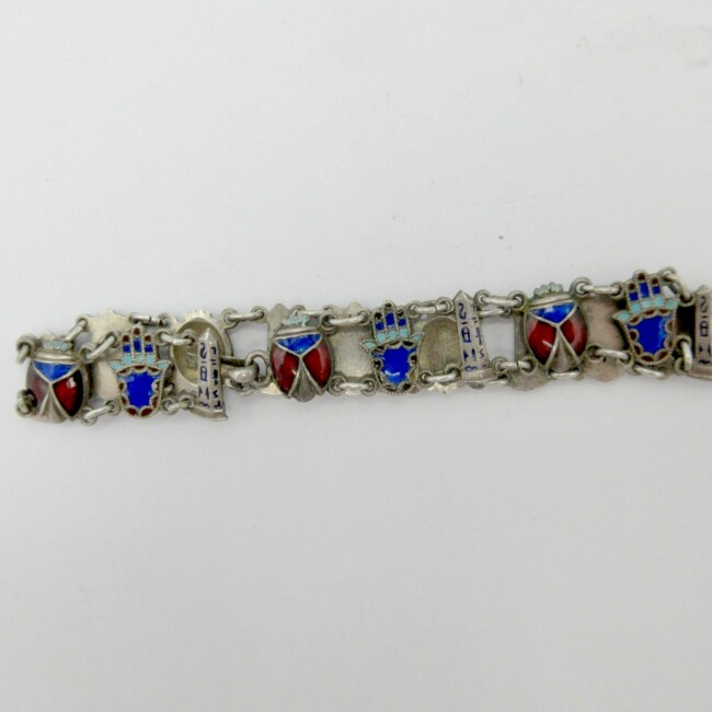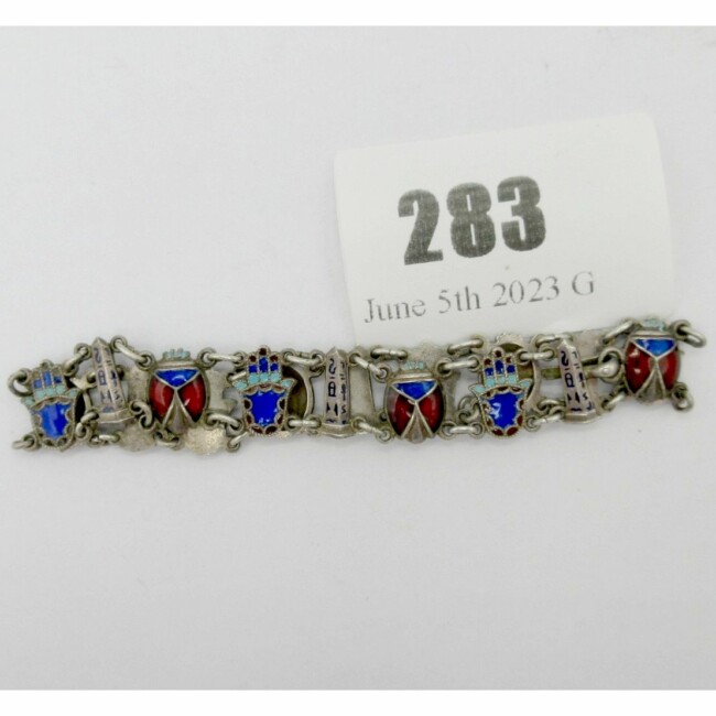 Current Bid: $46.33 [Refresh Price]YOU WILL NEED TO REFRESH THIS PAGE TO SEE UPDATED BID (Log in and this will update automatically) You must LOG IN or REGISTER to see this full page auction listing and bid. Auction is Over Winning Bid Amount: $46.33 **Lot Details: (LOT: G283) - Antique .800 coin Silver Egyptian themed bracelet with scarab beetles and obelisks. Approx 6.5" and in great shape. Unmarked, but tests as silver. Log in to add this lot to your watch list or place a bid |