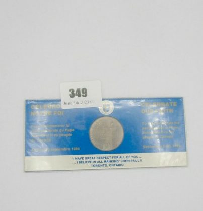 Current Bid: $7.00 [Refresh Price]YOU WILL NEED TO REFRESH THIS PAGE TO SEE UPDATED BID (Log in and this will update automatically) You must LOG IN or REGISTER to see this full page auction listing and bid. Auction is Over Winning Bid Amount: $7.00 **Lot Details: (LOT: G349) - Special Sealed Medallion to commemorate the pastoral visit of Pope John Paul 2 to Canada on Sept 9th 1984, own a piece of history. Log in to add this lot to your watch list or place a bid |