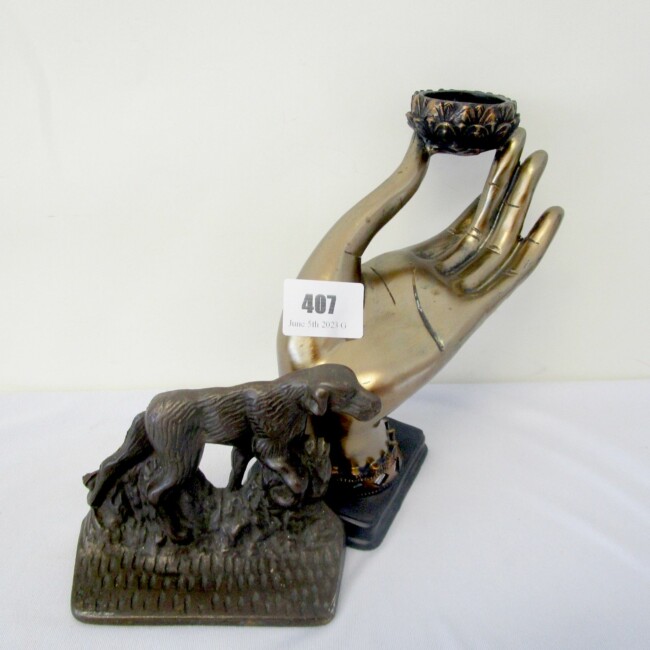 Current Bid: $11.00 [Refresh Price]YOU WILL NEED TO REFRESH THIS PAGE TO SEE UPDATED BID (Log in and this will update automatically) You must LOG IN or REGISTER to see this full page auction listing and bid. Auction is Over Winning Bid Amount: $11.00 **Lot Details: (LOT: G407) - Lot of 2 items, cast iron Irish Setter book end 5” x 5” and unique hand on stand tealight holder 8” Log in to add this lot to your watch list or place a bid |