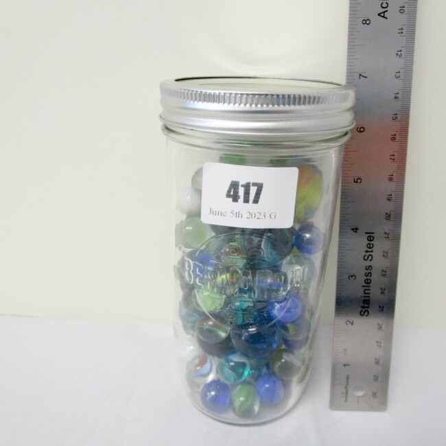 Current Bid: $9.00 [Refresh Price]YOU WILL NEED TO REFRESH THIS PAGE TO SEE UPDATED BID (Log in and this will update automatically) You must LOG IN or REGISTER to see this full page auction listing and bid. Auction is Over Winning Bid Amount: $9.00 **Lot Details: (LOT: G417) - mason jar full of assorted size marbles Log in to add this lot to your watch list or place a bid |