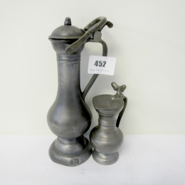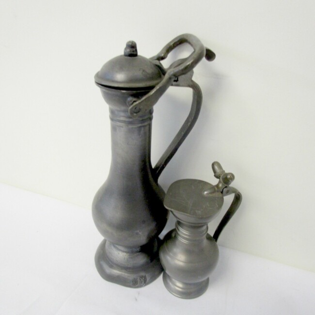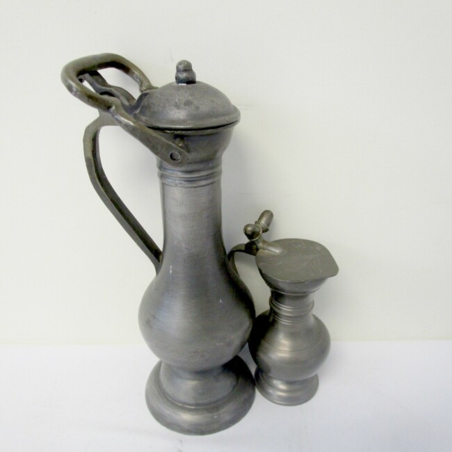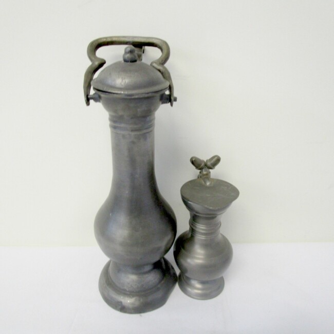 Current Bid: $9.00 [Refresh Price]YOU WILL NEED TO REFRESH THIS PAGE TO SEE UPDATED BID (Log in and this will update automatically) You must LOG IN or REGISTER to see this full page auction listing and bid. Auction is Over Winning Bid Amount: $9.00 **Lot Details: (LOT: G452) - 2 antique syrup/creamer lidded servers- tall one is 8 inches and has a handle for hanging and the small one 5 inches with double acorn finial Log in to add this lot to your watch list or place a bid |