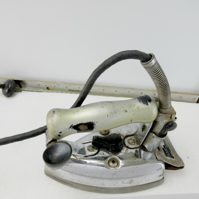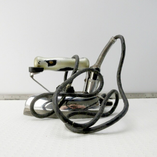 Current Bid: $7.00 [Refresh Price]YOU WILL NEED TO REFRESH THIS PAGE TO SEE UPDATED BID (Log in and this will update automatically) You must LOG IN or REGISTER to see this full page auction listing and bid. Auction is Over Winning Bid Amount: $7.00 **Lot Details: (LOT: G460) - A vintage ''General Electric'' Hotpoint Iron. approx 1930s, with original cord & in working condition. Only weights 4 lbs. and a vintage ASBESTOS sad iron, weighs 5 lbs Great for collection or or antique ... Log in to add this lot to your watch list or place a bid |