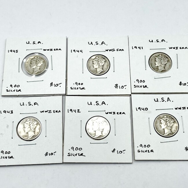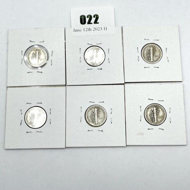 Current Bid: $87.00 [Refresh Price]YOU WILL NEED TO REFRESH THIS PAGE TO SEE UPDATED BID (Log in and this will update automatically) You must LOG IN or REGISTER to see this full page auction listing and bid. Auction is Over Winning Bid Amount: $87.00 **Lot Details: (LOT: H22) - U.S.A., “Six” WWII Era, .900 Silver Mercury Dimes. 1940,41,42,43,44and 1945. Log in to add this lot to your watch list or place a bid |