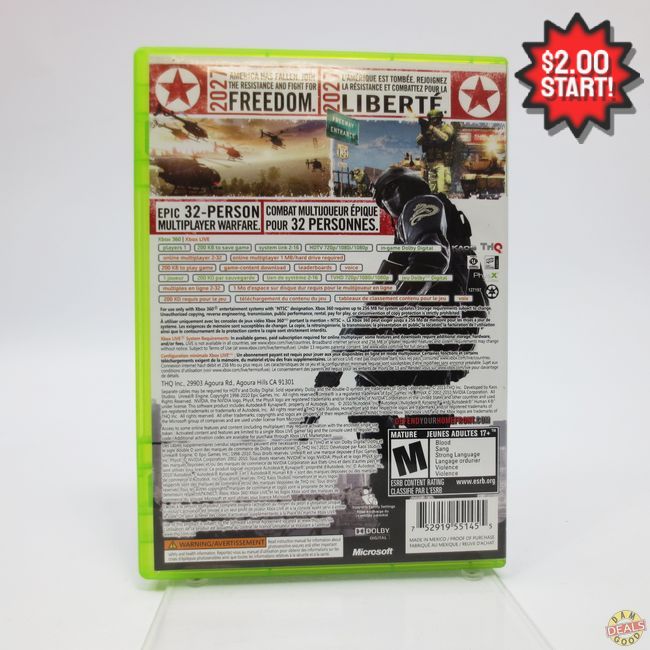 Current Bid: $2.00 [Refresh Price]YOU WILL NEED TO REFRESH THIS PAGE TO SEE UPDATED BID (Log in and this will update automatically) You must LOG IN or REGISTER to see this full page auction listing and bid. Auction is Over Winning Bid Amount: $2.00 **Lot Details: (LOT: Z663) - HOMEFRONT for XBOX 360. Previously enjoyed and inspected by staff. Determined to be in excellent playable condition. Please view the photos to see how complete and overall condition this game is in. Log in to add this lot to your watch list or place a bid |
