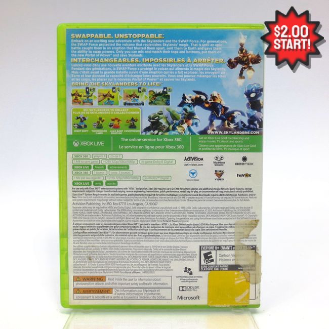 Current Bid: $2.00 [Refresh Price]YOU WILL NEED TO REFRESH THIS PAGE TO SEE UPDATED BID (Log in and this will update automatically) You must LOG IN or REGISTER to see this full page auction listing and bid. Auction is Over Winning Bid Amount: $2.00 **Lot Details: (LOT: Z666) - Skylanders Swap Force XBOX 360 Log in to add this lot to your watch list or place a bid |
