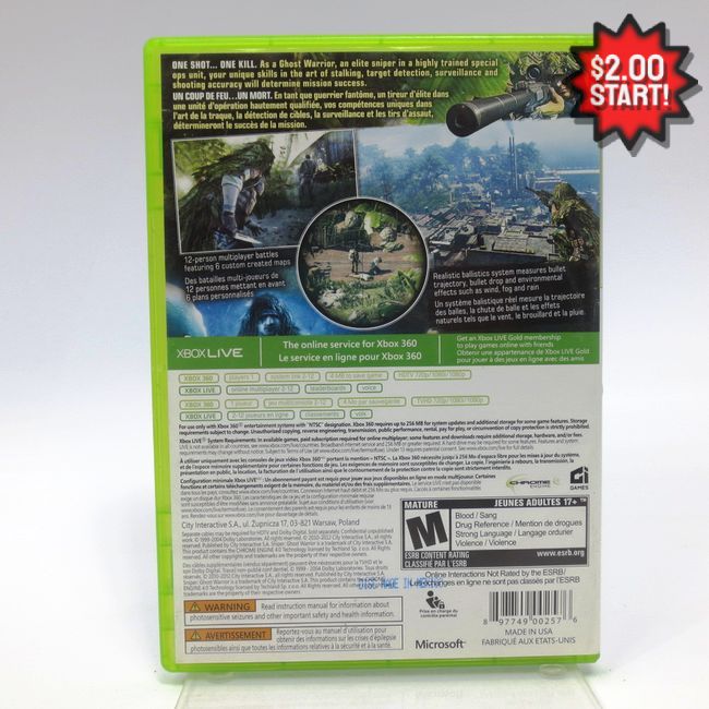 Current Bid: $2.00 [Refresh Price]YOU WILL NEED TO REFRESH THIS PAGE TO SEE UPDATED BID (Log in and this will update automatically) You must LOG IN or REGISTER to see this full page auction listing and bid. Auction is Over Winning Bid Amount: $2.00 **Lot Details: (LOT: Z671) - SNIPER Ghost Warrior Platinum hits XBOX 360 Log in to add this lot to your watch list or place a bid |