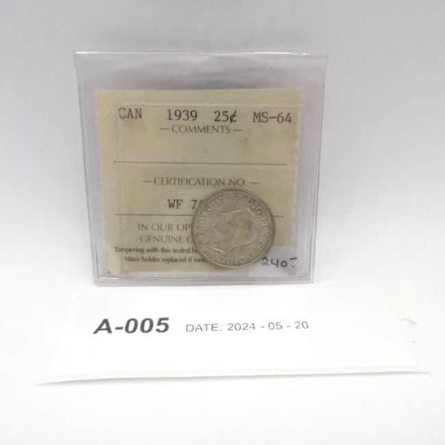 Current Bid: $140.01 [Refresh Price]YOU WILL NEED TO REFRESH THIS PAGE TO SEE UPDATED BID (Log in and this will update automatically) You must LOG IN or REGISTER to see this full page auction listing and bid. Auction is Over Winning Bid Amount: $140.01 **Lot Details: (LOT: A5) - Canada 1939 (WWll Era) Silver Twenty Five Cents, ICCS Certified MS-64. Ultra High Certification on this Frosty, King George VI Quarter. Gorgeous Coin. Log in to add this lot to your watch list or place a bid |