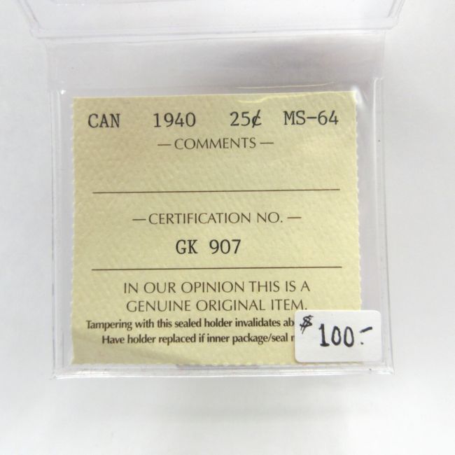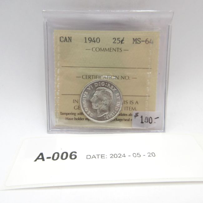 Current Bid: $71.00 [Refresh Price]YOU WILL NEED TO REFRESH THIS PAGE TO SEE UPDATED BID (Log in and this will update automatically) You must LOG IN or REGISTER to see this full page auction listing and bid. Auction is Over Winning Bid Amount: $71.00 **Lot Details: (LOT: A6) - Canada 1940 (WWll Era) Silver Twenty Five Cents, ICCS Certified MS-64. Ultra High Certification on this Frosty, King George VI Quarter. Gorgeous Coin. Log in to add this lot to your watch list or place a bid |