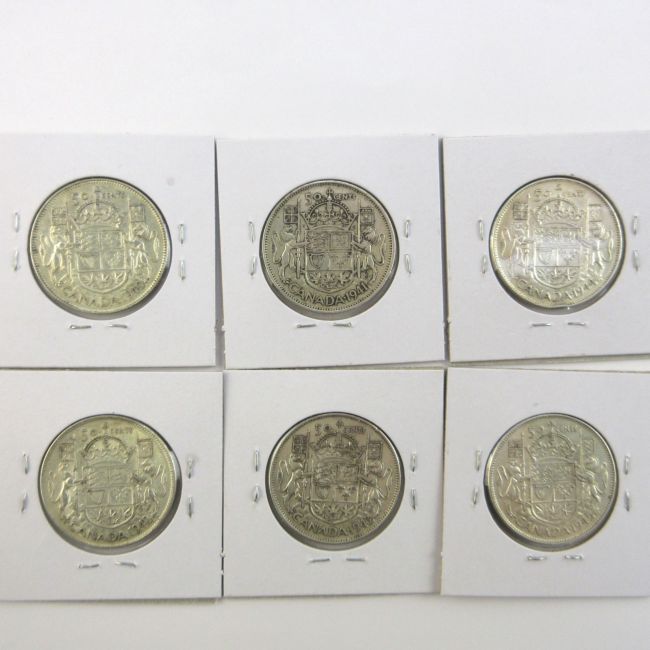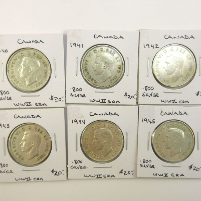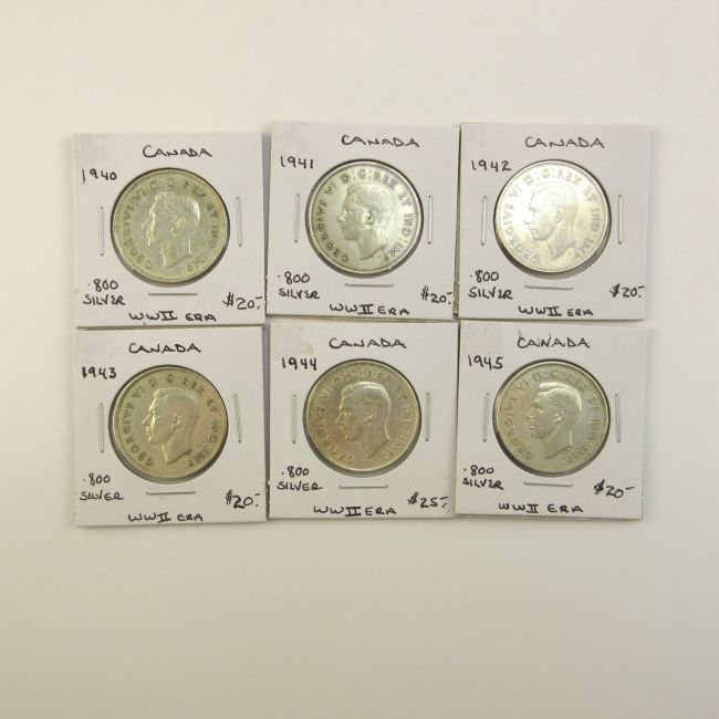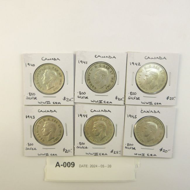 Current Bid: $112.00 [Refresh Price]YOU WILL NEED TO REFRESH THIS PAGE TO SEE UPDATED BID (Log in and this will update automatically) You must LOG IN or REGISTER to see this full page auction listing and bid. Auction is Over Winning Bid Amount: $112.00 **Lot Details: (LOT: A9) - Canada “Six” WWII Era Silver Half Dollars. 1940,41,42,43,44 and 1945 all in Great Condition. Log in to add this lot to your watch list or place a bid |