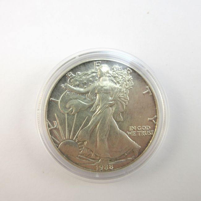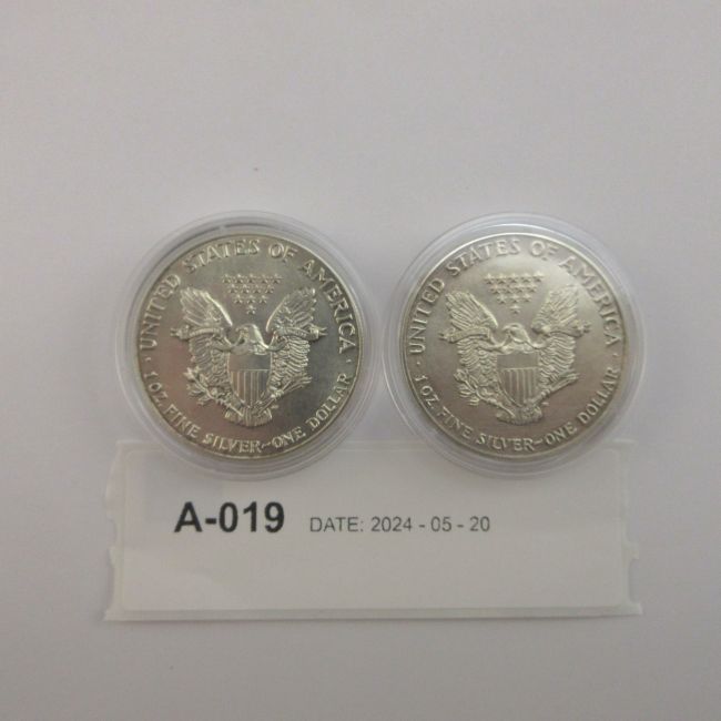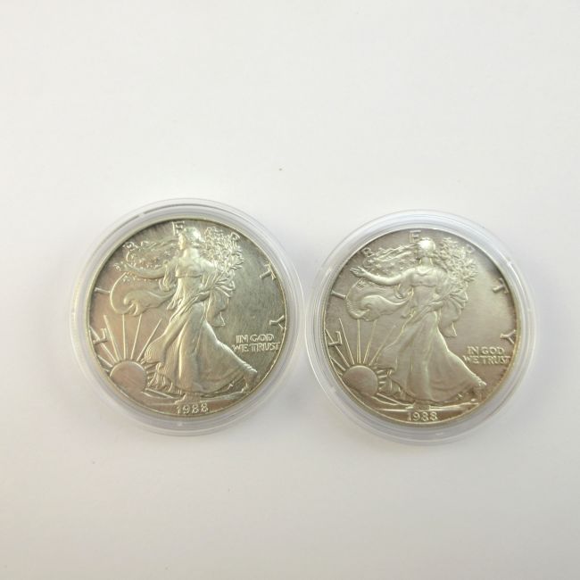 Current Bid: $95.00 [Refresh Price]YOU WILL NEED TO REFRESH THIS PAGE TO SEE UPDATED BID (Log in and this will update automatically) You must LOG IN or REGISTER to see this full page auction listing and bid. Auction is Over Winning Bid Amount: $95.00 **Lot Details: (LOT: A19) - USA, 1988,“Two” Eagle One Ounce Silver Coins. Both Pure Silver coins are in perfect condition, sealed in Capsules .999 Log in to add this lot to your watch list or place a bid |