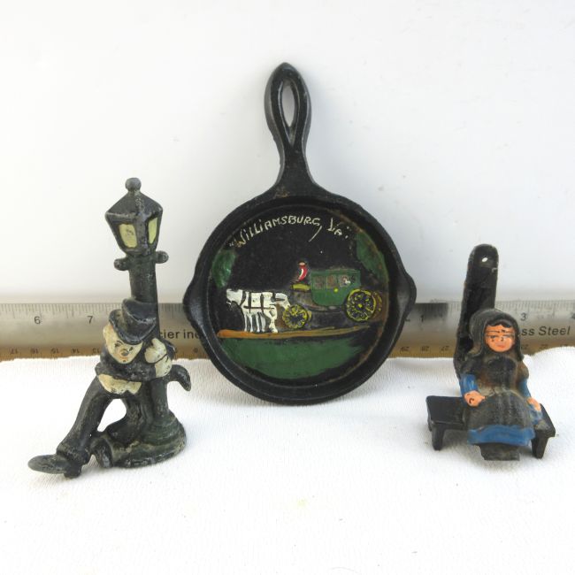Current Bid: $5.00 [Refresh Price]YOU WILL NEED TO REFRESH THIS PAGE TO SEE UPDATED BID (Log in and this will update automatically) You must LOG IN or REGISTER to see this full page auction listing and bid. Auction is Over Winning Bid Amount: $5.00 **Lot Details: (LOT: A116) - Vintage Cast Iron Mini Buggy Skillet Frying Pan Horse. Drunk Man On Lamp Post Bottle Opener, Also Vintage Black Cast Iron Amish Girl On Bench,Wall Hook.Card Holder Log in to add this lot to your watch list or place a bid |