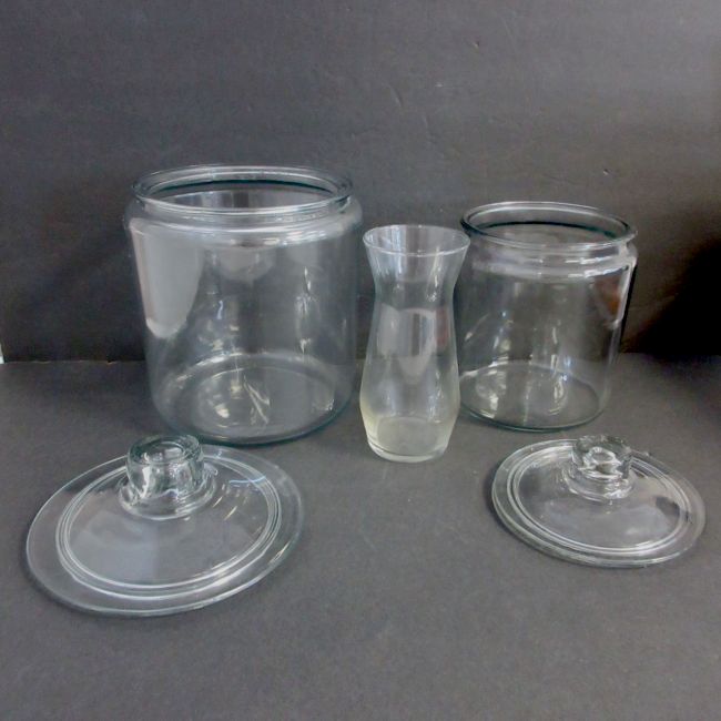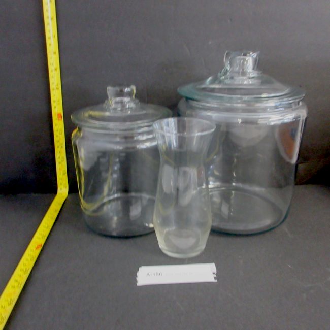 Current Bid: $11.00 [Refresh Price]YOU WILL NEED TO REFRESH THIS PAGE TO SEE UPDATED BID (Log in and this will update automatically) You must LOG IN or REGISTER to see this full page auction listing and bid. Auction is Over Winning Bid Amount: $11.00 **Lot Details: (LOT: A156) - Glass Lot. 2 Large glass jars with lids ( 8” and 6 ½” high without lid), plus a 7” glass vase. Log in to add this lot to your watch list or place a bid |