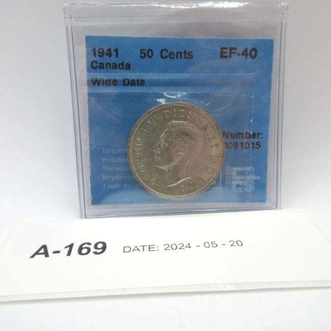 Current Bid: $22.00 [Refresh Price]YOU WILL NEED TO REFRESH THIS PAGE TO SEE UPDATED BID (Log in and this will update automatically) You must LOG IN or REGISTER to see this full page auction listing and bid. Auction is Over Winning Bid Amount: $22.00 **Lot Details: (LOT: A169) - 1941 Canada 50 Cents, CCCS graded EF-40, Wide Date, 80 percent silver Log in to add this lot to your watch list or place a bid |