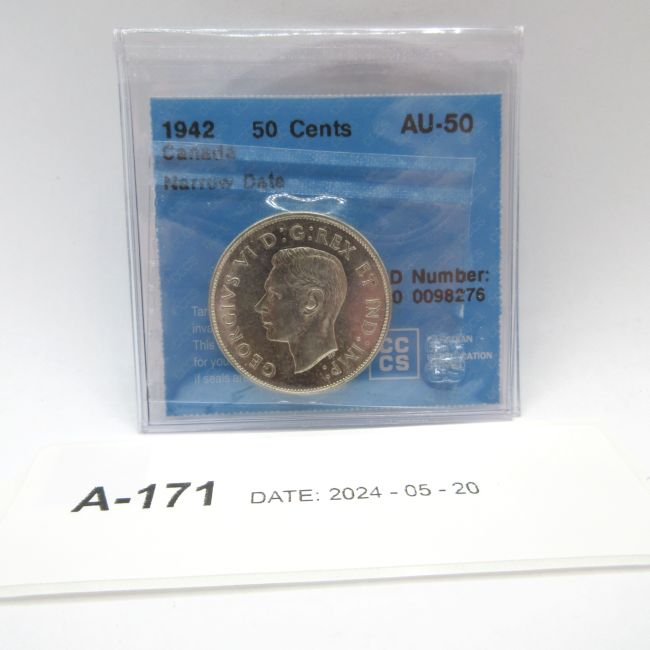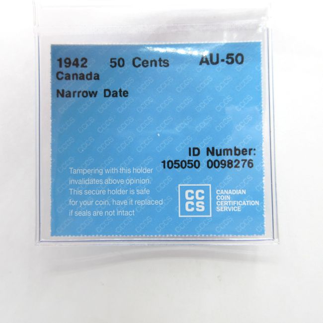 Current Bid: $19.10 [Refresh Price]YOU WILL NEED TO REFRESH THIS PAGE TO SEE UPDATED BID (Log in and this will update automatically) You must LOG IN or REGISTER to see this full page auction listing and bid. Auction is Over Winning Bid Amount: $19.10 **Lot Details: (LOT: A171) - 1942 Canada 50 Cents, CCCS graded AU-50, Narrow Date, 80 percent silver Log in to add this lot to your watch list or place a bid |