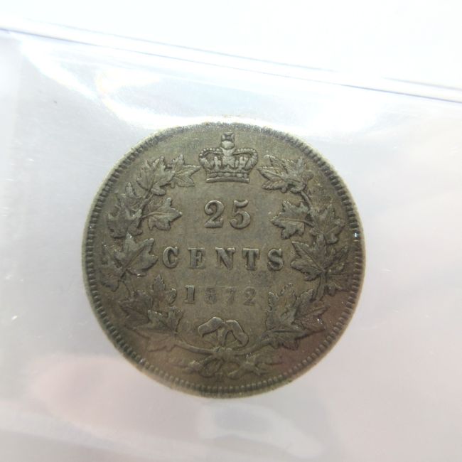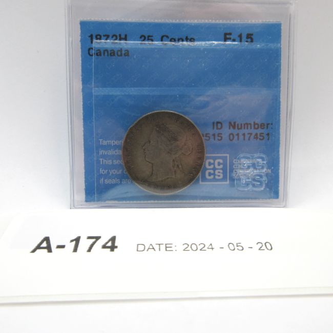 Current Bid: $31.50 [Refresh Price]YOU WILL NEED TO REFRESH THIS PAGE TO SEE UPDATED BID (Log in and this will update automatically) You must LOG IN or REGISTER to see this full page auction listing and bid. Auction is Over Winning Bid Amount: $31.50 **Lot Details: (LOT: A174) - 1872 H Canada 25 Cents, CCCS graded F-15, 92.5 percent silver Log in to add this lot to your watch list or place a bid |