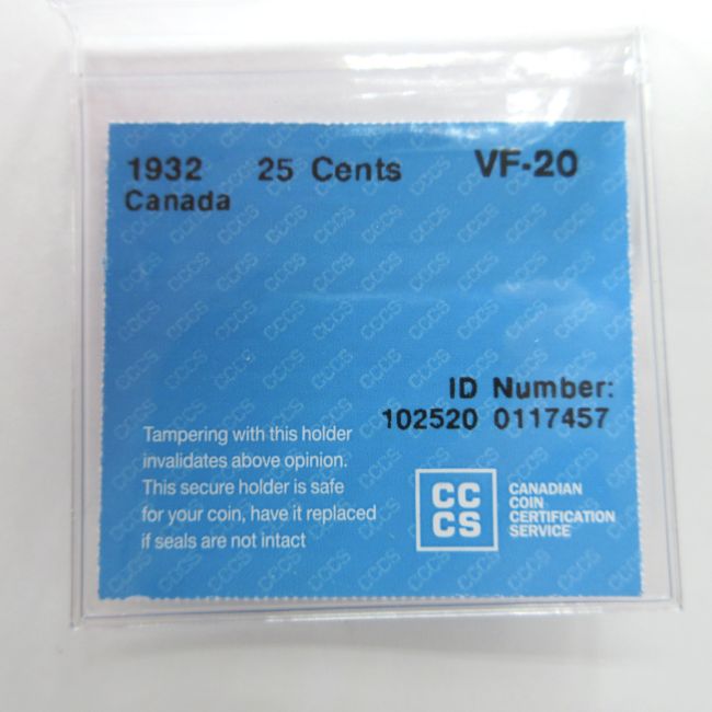 Current Bid: $25.10 [Refresh Price]YOU WILL NEED TO REFRESH THIS PAGE TO SEE UPDATED BID (Log in and this will update automatically) You must LOG IN or REGISTER to see this full page auction listing and bid. Auction is Over Winning Bid Amount: $25.10 **Lot Details: (LOT: A177) - 1932 Canada 25 Cents, CCCS graded VF-20, 80 percent silver Log in to add this lot to your watch list or place a bid |