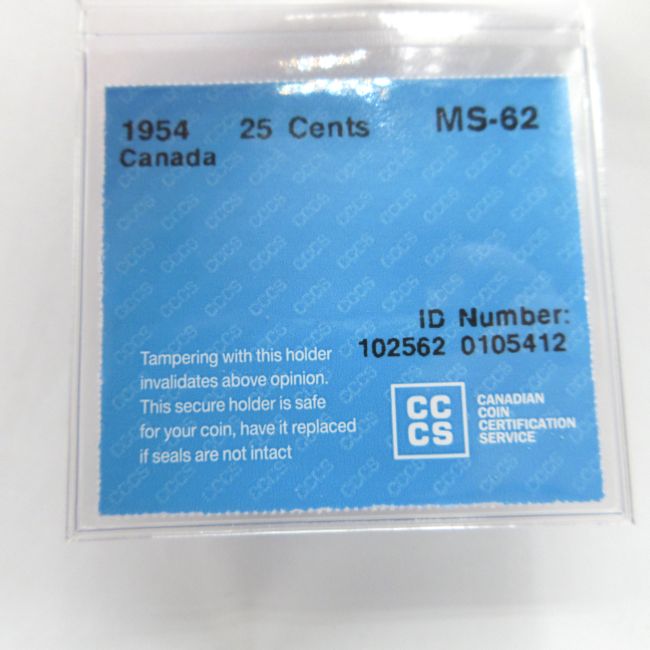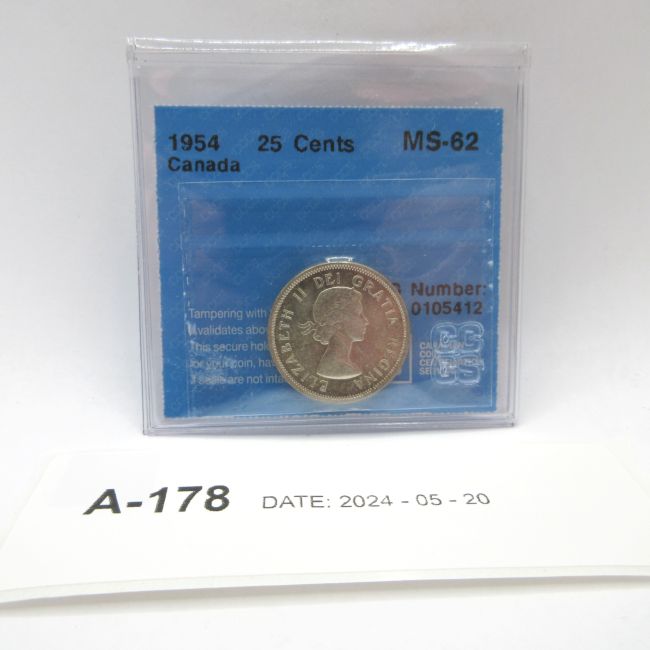 Current Bid: $34.10 [Refresh Price]YOU WILL NEED TO REFRESH THIS PAGE TO SEE UPDATED BID (Log in and this will update automatically) You must LOG IN or REGISTER to see this full page auction listing and bid. Auction is Over Winning Bid Amount: $34.10 **Lot Details: (LOT: A178) - 1954 Canada 25 Cents, CCCS graded MS-62, 80 percent silver Log in to add this lot to your watch list or place a bid |