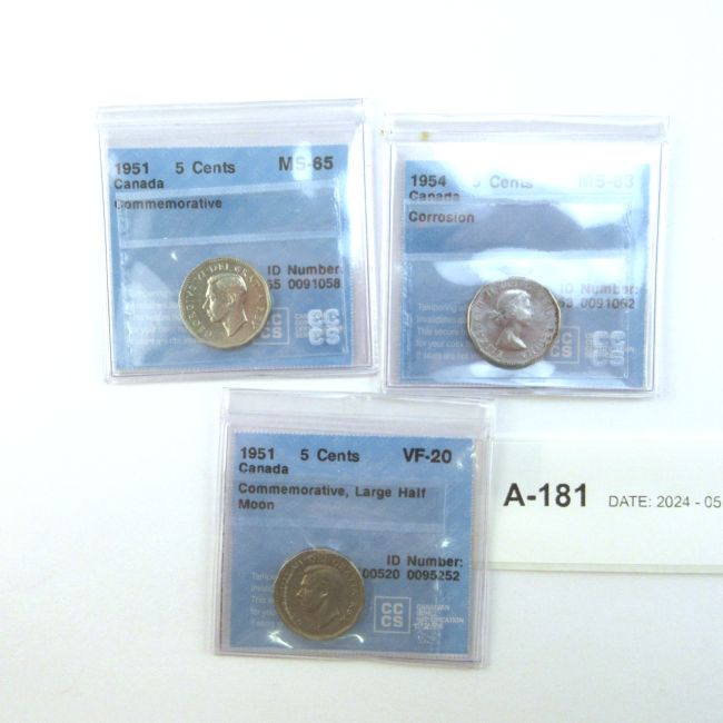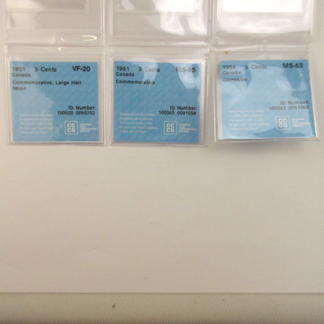 Current Bid: $14.00 [Refresh Price]YOU WILL NEED TO REFRESH THIS PAGE TO SEE UPDATED BID (Log in and this will update automatically) You must LOG IN or REGISTER to see this full page auction listing and bid. Auction is Over Winning Bid Amount: $14.00 **Lot Details: (LOT: A181) - 1951 Canada 5 Cents, CCCS graded VF-20, Commemorative, Large Half Moon, 1951 Canada 5 Cents, CCCS graded MS-65, Commemorative, and 1954 Canada 5 Cents, CCCS graded MS-63, Corrosion, all coins nickel and chromium comp... Log in to add this lot to your watch list or place a bid |