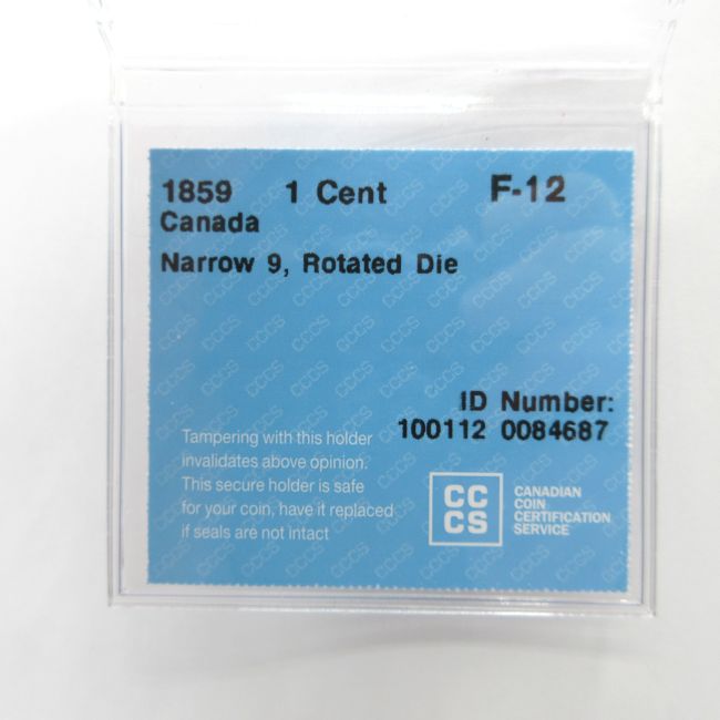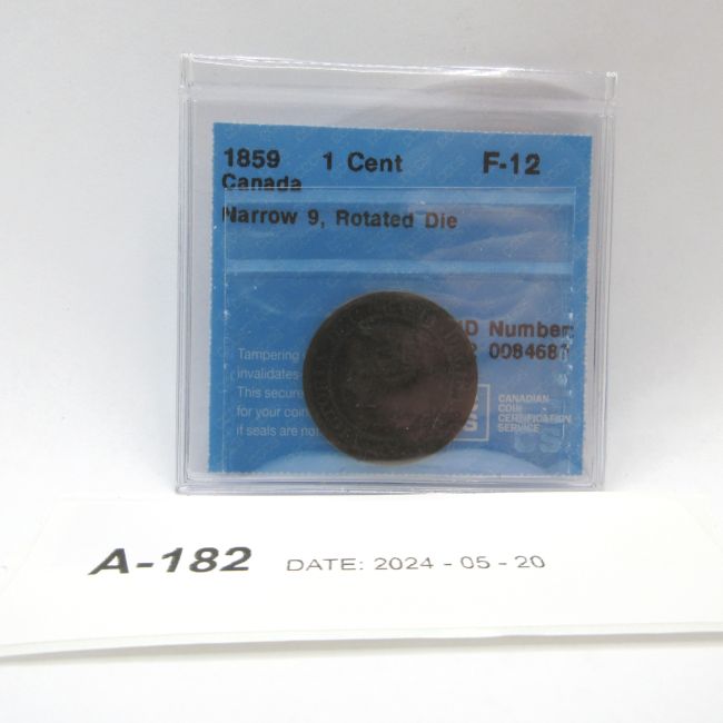 Current Bid: $39.00 [Refresh Price]YOU WILL NEED TO REFRESH THIS PAGE TO SEE UPDATED BID (Log in and this will update automatically) You must LOG IN or REGISTER to see this full page auction listing and bid. Auction is Over Winning Bid Amount: $39.00 **Lot Details: (LOT: A182) - 1859 Canada 1 Cent, CCCS graded F-12, Narrow 9, Rotated Die Log in to add this lot to your watch list or place a bid |